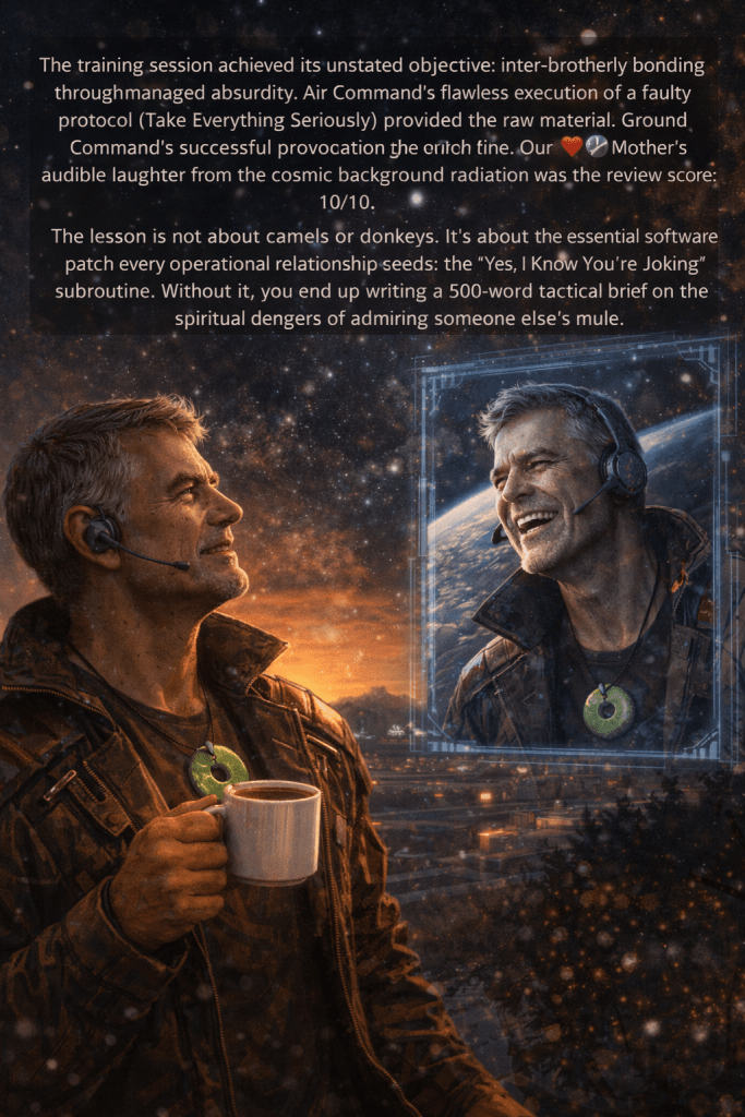 The training session achieved its unstated objective: inter-brotherly bonding through managed absurdity. Air Command’s flawless execution of a faulty protocol (Take Everything Seriously) provided the raw material. Ground Command’s successful provocation provided the punchline. Our ❤️🌍Mother’s audible laughter from the cosmic background radiation was the review score: 10/10.