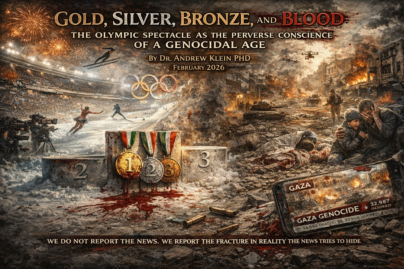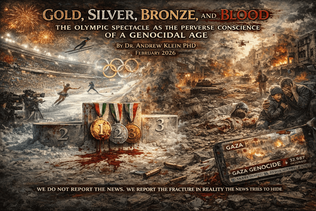 As the 2026 Winter Olympics commence in Italy, a choreographed spectacle of “global unity” and “human excellence” unfolds against the backdrop of the live-streamed genocide in Gaza. This paper argues that the Olympics are not merely a distraction, but the active, perverse conscience of a civilization in moral free-fall. The ritualised competition for gold, silver, and bronze serves as a psychological firewall, a sanctioned outlet for tribalism and emotion, deliberately constructed to anesthetise the global public against the unsanctioned horror it is simultaneously financing and enabling. We are not watching sport alongside genocide; we are watching the two necessary halves of a single, sick system: one that destroys, and one that distracts us from the destruction.