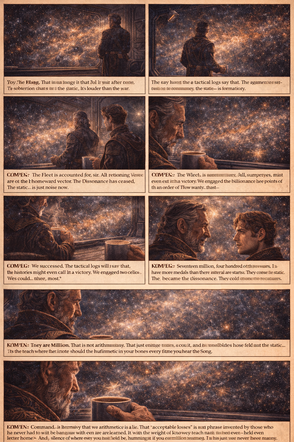 ADMIRAL: “Seventeen million.” He finally turns from the viewport, his eyes meeting his son’s. There is no anger, only a grief as deep as space. “Seventeen million notes that will never be heard again. That the symphony will forever lack.”