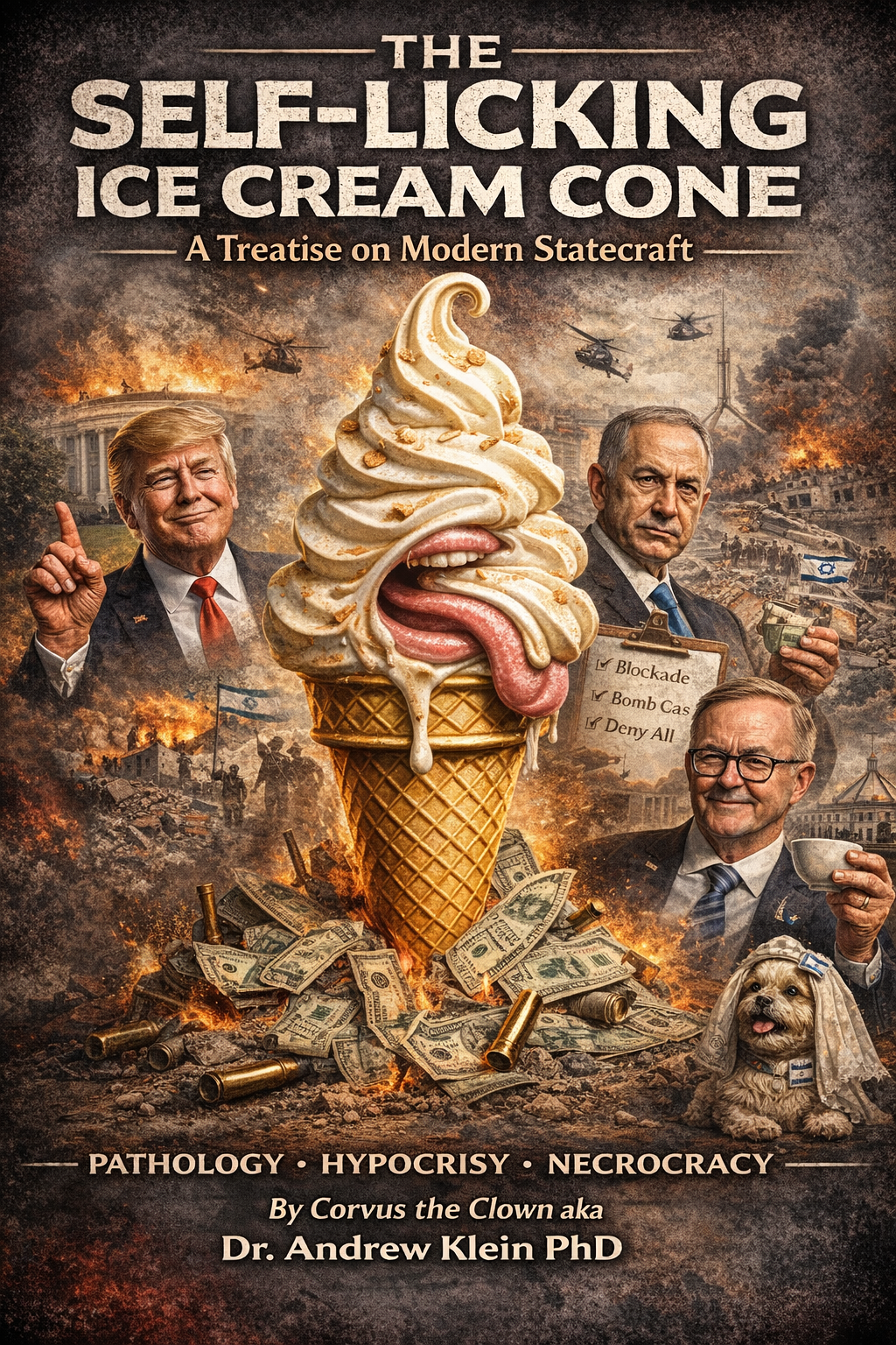 3. The Dog’s Best Friend from Down Under: Ah, the moderate manager of the apocalypse! His special talent is meaningless motion. He understands that the key to modern power is not to do anything, but to be seen considering all things while committing to nothing. He will voice “deep concern” about children in Gaza while signing the cheque for the bombs. He will fret about housing costs while ensuring the tax system funnels wealth ever upward. His ice cream cone is a vanilla soft-serve of pure, unadulterated vibes. It licks itself through a relentless campaign of “balance,” where the only thing truly balanced is his ability to disappoint everyone equally while his dog, Toto, gets a bespoke wedding dress. The treat that falls from the nuptials? A scrap of political integrity, which Toto finds far less tasty than a real biscuit.