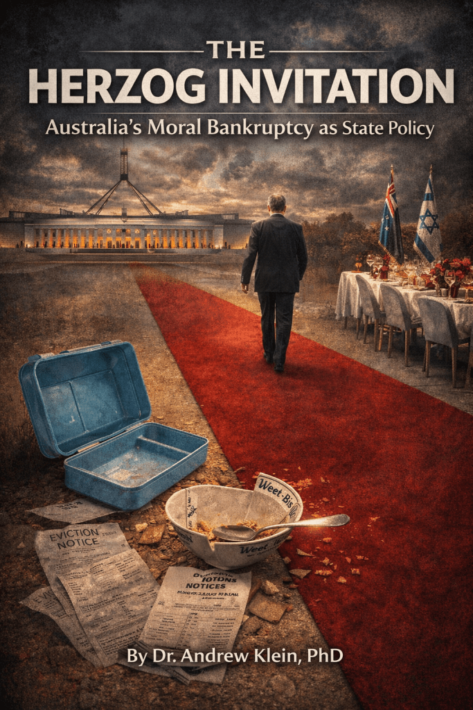 The state visit of Israeli President Isaac Herzog is not a diplomatic event. It is a crystallization of Australia’s comprehensive moral and legal failure. This paper analyses the invitation through three lenses: 1) Its violation of international legal principle in the context of the International Court of Justice (ICJ) proceedings; 2) Its function as a strategic distraction from catastrophic domestic neglect; and 3) Its revelation of a captured political narrative, where a foreign state accused of genocide commands more political capital in Canberra than Australia’s own hungry, homeless, and First Nations peoples. We argue this represents not an error in judgement, but the logical endpoint of a political duopoly that has abandoned the foundational duty of the state: to protect its people and uphold the law.