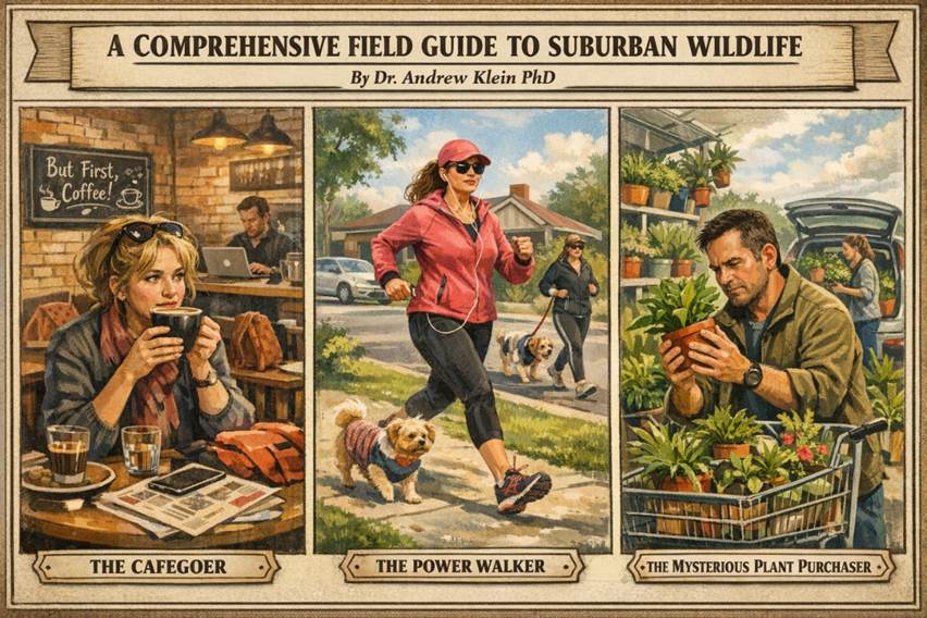 The suburbs of Boronia host a rich tapestry of life, each species adapted to its unique niche in the urban ecosystem. From the Cafegoer’s territorial displays to the Powerwalker’s deposit-leaving rituals, from the Mysterious Plant Purchaser’s acquisitive compulsions to the Kerbside Vigilante’s critical assessments—all contribute to the vibrant, absurd, wonderful chaos of suburban existence.