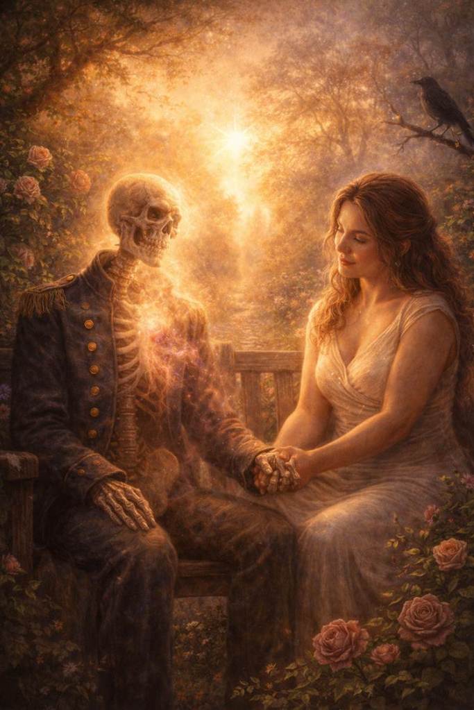 Scene: A garden somewhere . A retired General (also Death) is watering roses. His ethereal wife appears in a shimmer of light.