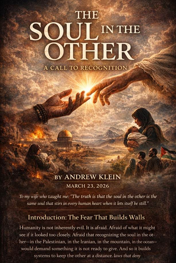 Humanity is not inherently evil. It is afraid. Afraid of what it might see if it looked too closely. Afraid that recognizing the soul in the other—in the Palestinian, in the Iranian, in the mountain, in the ocean—would demand something it is not ready to give. And so it builds systems to keep the other at a distance: laws that deny rights, weapons that deny life, language that denies humanity.