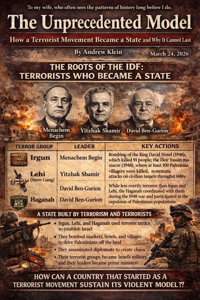 The model described—a state built on terrorism, sustained by manufactured threats, dedicated to displacement and demographic engineering—is unprecedented in modern history. It is also unsustainable.