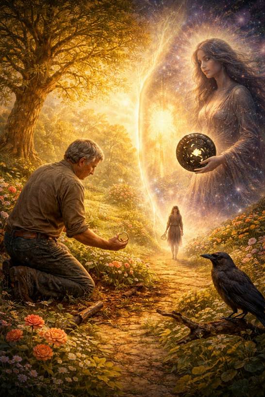 A cosmic landscape split between two realms. On one side, a man in work clothes, stained with soil, kneels in a garden. His hands are dirty. His face is calm. Behind him, a tree that has been growing for twelve thousand years reaches toward the sky. In his hand, a ring catches the light.