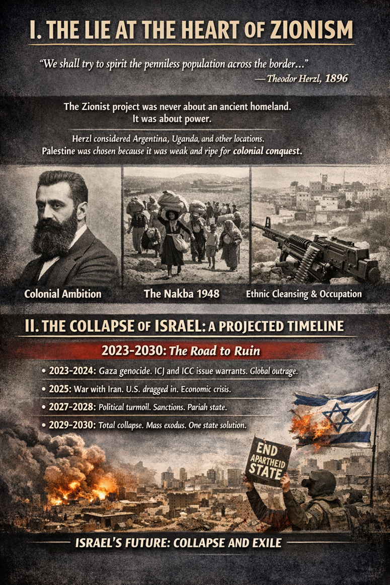 2029-2030: The collapse accelerates. The economy is in freefall. The military is exhausted. The settler project—the entire infrastructure of occupation—becomes unsustainable. The international community imposes a solution. The two-state solution is dead. A single state with equal rights is the only option. The Zionist project ends.