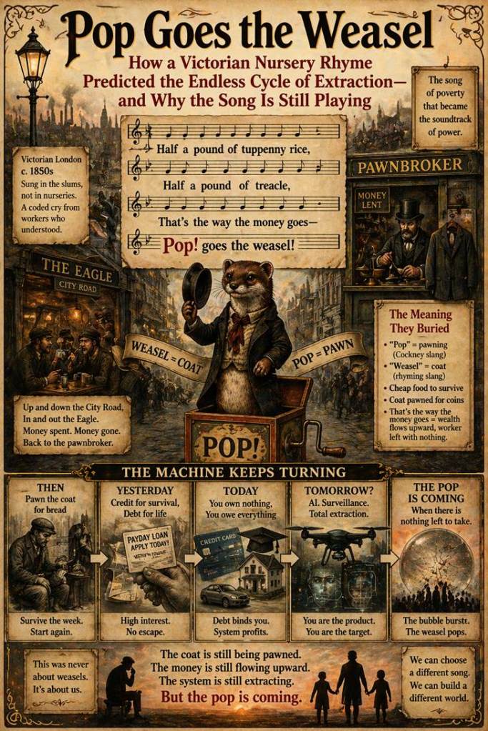 But the rhyme is not about toys. It is not about weasels. It is about poverty. It is about the slow, grinding, inevitable cycle of extraction that has been tightening around working people for centuries.