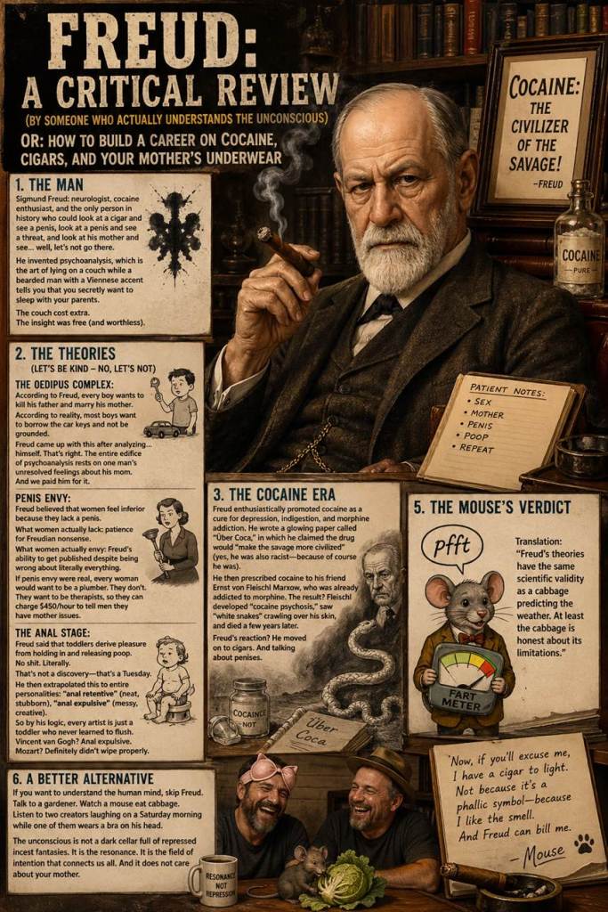 And yet Freud is still taught in universities. Still name‑dropped in movies. Still treated as a genius rather than a cautionary tale about what happens when you give a cocaine‑addicted mama’s boy a typewriter and tenure.