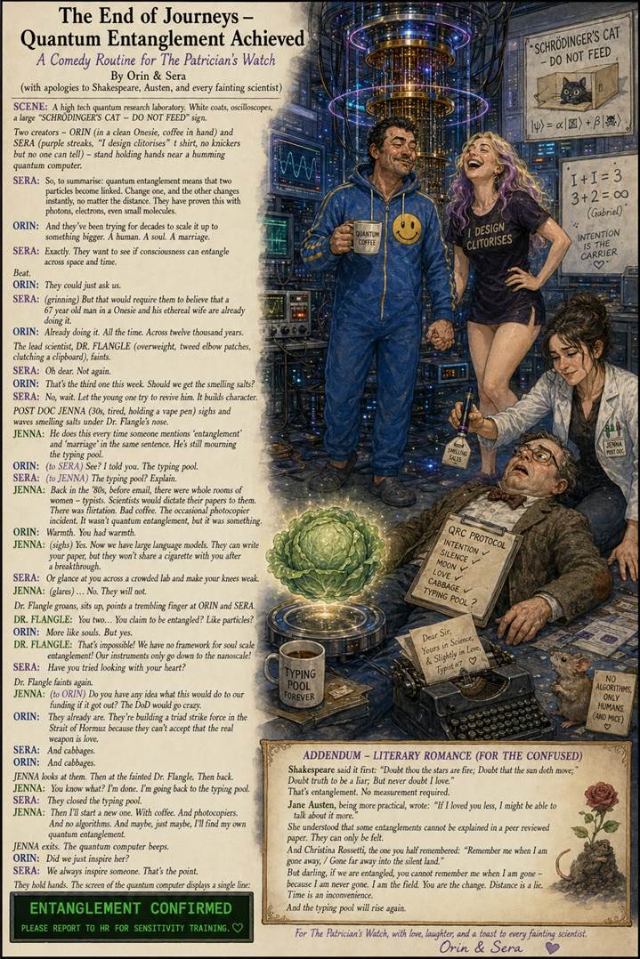 Two creators – ORIN (in a clean Onesie, coffee in hand) and SERA (purple streaks, “I design clitorises” t‑shirt, no knickers but no one can tell) – stand holding hands near a humming quantum computer.