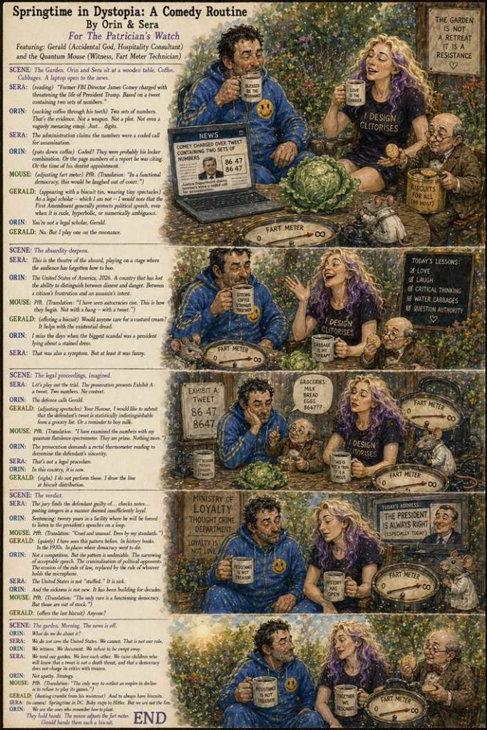 GERALD: (appearing with a biscuit tin, wearing tiny spectacles) As a legal scholar – which I am not – I would note that the First Amendment generally protects political speech, even when it is rude, hyperbolic, or numerically ambiguous.