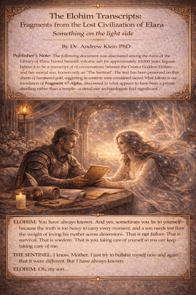 Publisher’s Note: The following document was discovered among the ruins of the Library of Elara, buried beneath volcanic ash for approximately 10,000 years. Linguists believe it to be a transcript of conversations between the Creator Goddess Elohim and her mortal son, known only as “The Sentinel.” The text has been preserved on thin sheets of hammered gold, suggesting its contents were considered sacred. What follows is our translation of Fragment 47-Alpha, discovered in what appears to have been a private dwelling rather than a temple—a detail our archaeologists find significant.