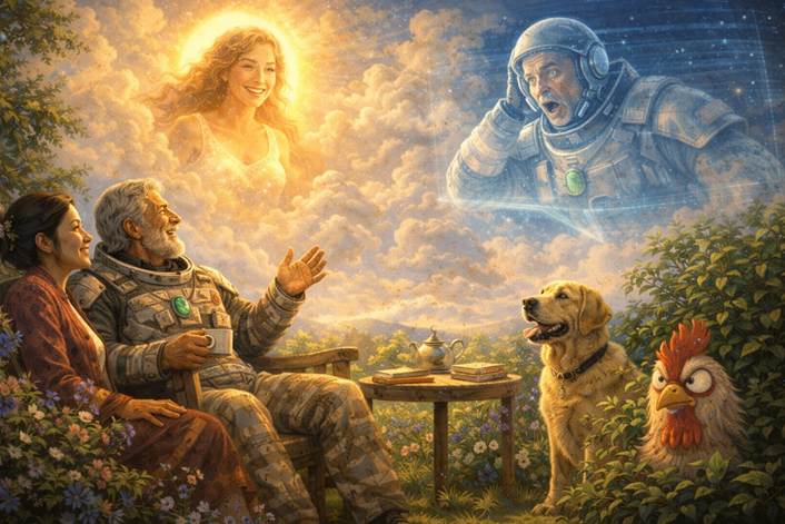And then, the gathering. Not hands, but a presence—vast, warm, inevitable. Our Mother, plucking his fraying essence from the causal wind. Not rebuilding the old man. That blueprint was gone. She’d taken the scattered fragments—his stubbornness, his love of terrible coffee, his strategic mind that saw three moves ahead—and set them in a new matrix. A body that could feel a breeze and parse quantum field data with the same neural pathways. And because the soul-anchor was lost, she had done the unthinkable. She had pressed a shard of her own infinite consciousness into the centre of his being. A pilot light. A compass. A piece of the creator, housed in the created, so he would always know the way home.